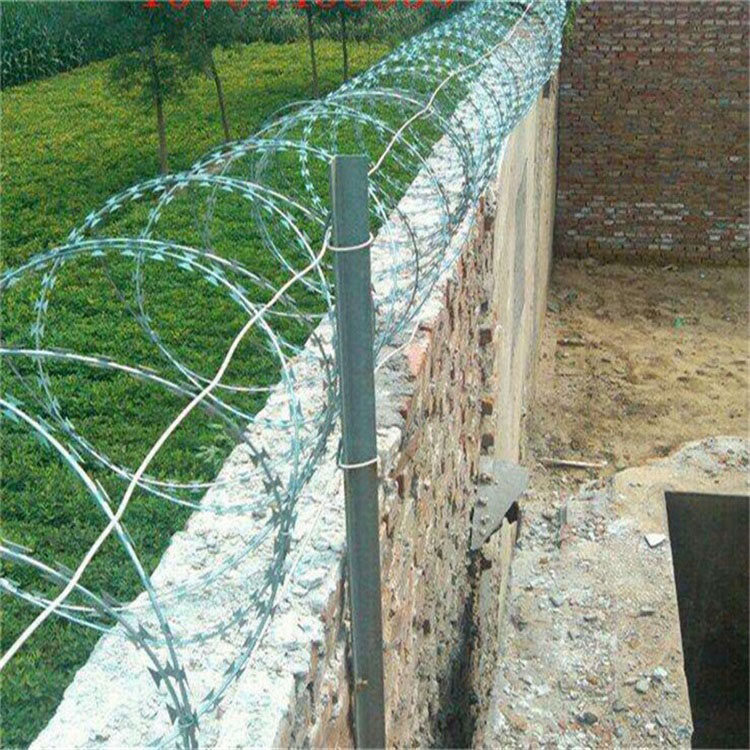 监狱刀刺钢网墙是由V型支架立柱,加强型焊接片网,安全防盗连接件和热镀锌刀片刺笼组成,强度和安全防御性级别很高。主要用途:看守所钢网墙主要用于监狱、哨所、边防、围禁区域、军事防御防护等高危险地区的防护。