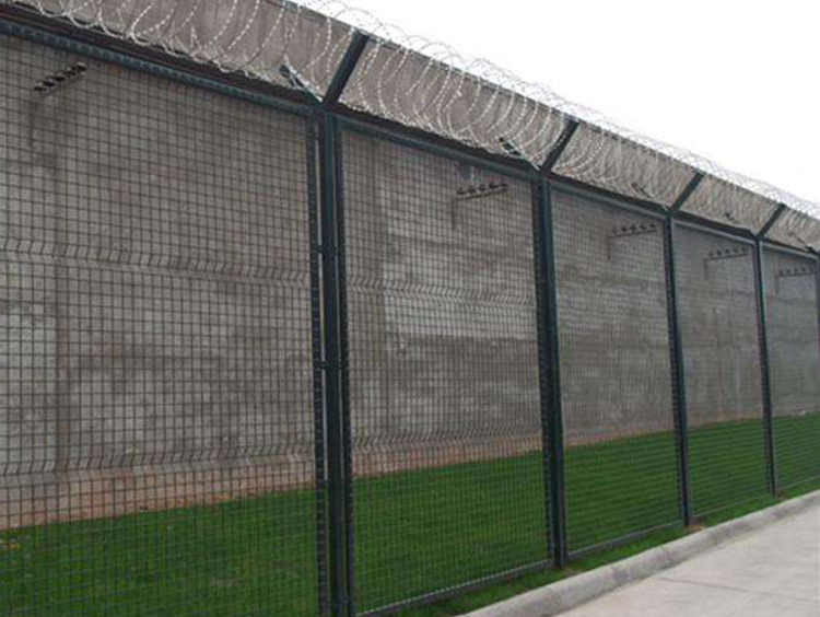 龙口监狱防逃脱隔离钢网墙规划:安装监狱钢网墙可以分为两种,一种是直接用法兰底座固定。另外一种是用水泥浇筑。法兰底座一般是在巡逻道安装,水泥浇筑一般是在地面安装,比如生活区、放风场等。我们可以根据您的要求为您设计方案,制作监狱钢网墙。