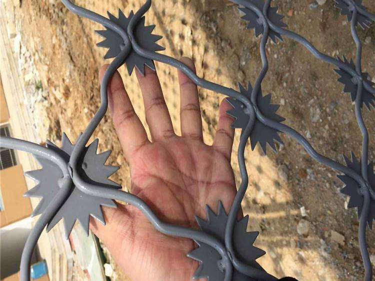 梅花刺隔离网安全性能高且具有吓阻、防翻越等效果,材质坚硬,高强度,高张力,造型设计独特,不宜触摸,因而能达到防护隔离效果。主要用于监狱、哨所、边防、围禁区域、军事防御防护等高危险地区的防护。