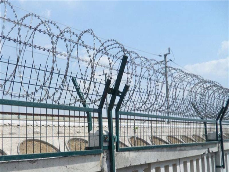 哨所加高双螺旋刀片围墙网产品特点:监狱防护网具有防腐、防老化、抗晒、耐候等特点。螺旋型交叉刀片刺网是在两条刀片刺网之间以不锈钢片和镀锌钢片强力夹扣,展开后即呈交叉状,美观又实用。可平地安装,也可在围墙上二次安装,有效防止攀逃。直刺式刺网隔离带,是用柱体和普通刺绳横、纵、斜向交叉绑定成刺网隔离带。