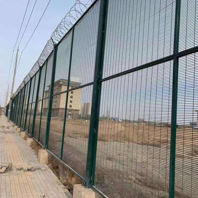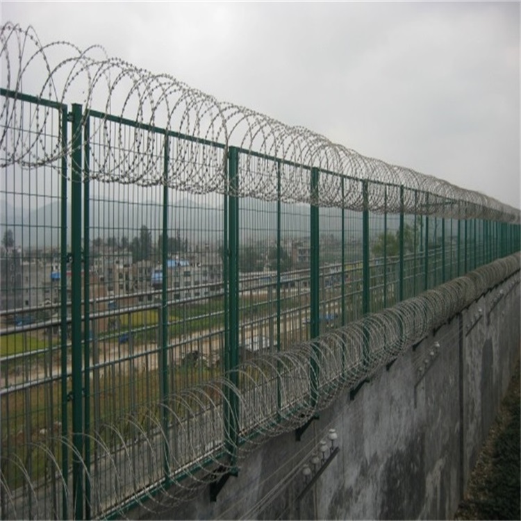河南监狱改扩建工程隔离网在立柱顶部加装刀网刺绳不但增强了安全防护性能,还能起到恐吓作用。监狱隔离网表面处理方式采用电镀、热镀、喷塑、浸塑等,具有很好的抗老化、抗晒、耐候等特点。监狱改扩建工程隔离网造型美观、花色多样,既起到围栏作用,又起到美化作用,网片连接方式采用特制SBS紧扣件,有效防止人为破坏性拆卸,隔离网横向四道折弯加强筋,使网面强度显著增加。见图