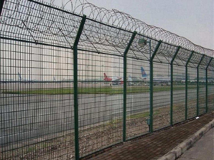 机场围界网其产品造型美观、花色多样,既起到围栏作用,又起到美化作用。在机场护栏网顶部安装刀片刺笼,很好的增加了安全防护性能,由V形支柱、焊接网和紧固件组成,不易变形,因此又称作“Y型安全防御护网”。