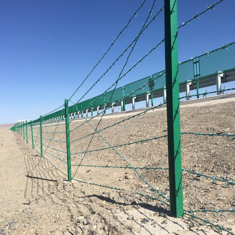 刺绳防护网、带刺铁丝网,刺丝防护栅栏,由全白动化的刺绳机拉编而成,区域名称不同,有称铁蒺藜。材质:优质低碳钢丝(镀锌、涂塑)PVC丝,有蓝、绿、墨绿等颜色。丝径:12#-14#( 2.6*2.2mm)14#-14#(2.2mm),成品种类:单丝拧编和双丝拧编。刺丝防护网编制及特点:拧编而成;牢固、美观。用途:用于草原边界,铁路、高速公路的隔离防护等。