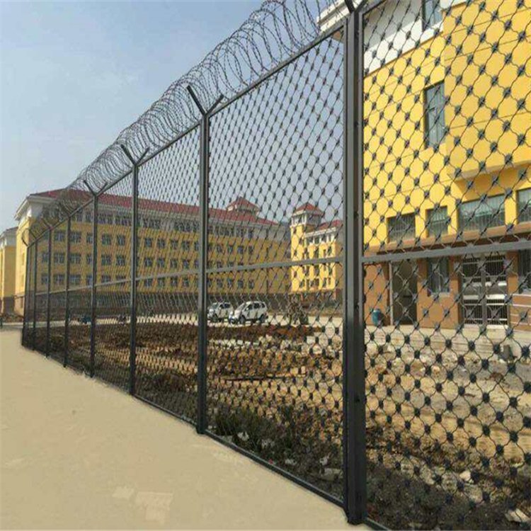 监狱钢网墙:一般钢网墙高度3--5米,立柱跨度为2-5米--3米。是由防盗美格网加焊防爬刺片而成,美格网的网孔一般为:100X100mm,丝径为:5-8mm,刺片直径50-150mm,形状似太阳,四周布满刺尖。