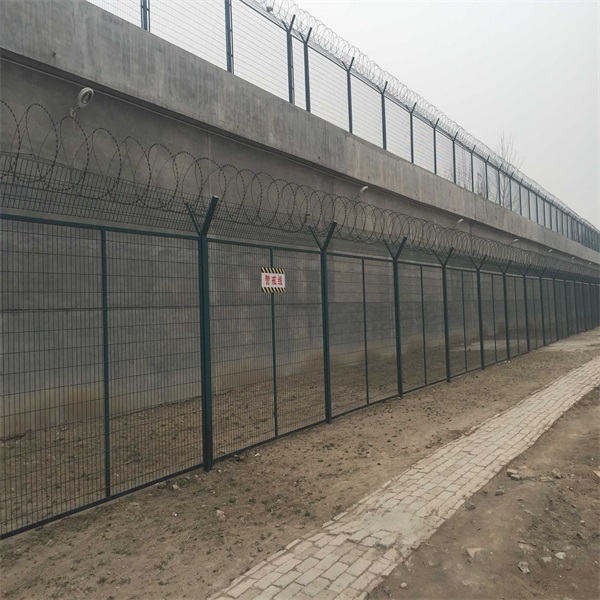 3、监狱隔离网喷塑制作流程,首先将工件脱脂一水洗一抛丸一磷化一烘干一静电喷涂(将工件连接静电,粉末经过喷枪喷射在工件表面)一高温固化一成品。优点:表面平整度、光泽度更优于浸塑表面,色彩艳丽,共有200多种颜色可供选择,防腐寿命7年以上监狱隔离网主要用途:监狱护栏网主要用于监狱、哨所、边防、国禁区域、军事防御防护等高危险地区的防护。监状护栏网规格侧号可根据需要加工订做。