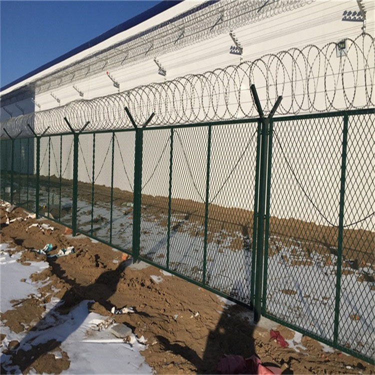 监狱围墙加装刀刺隔离网是由V型支架立柱,加强型焊接片网,安全防盗连接件和热镀锌刀片刺笼组成,强度和安全防御性级别高,螺旋型交叉刀片刺网是在两条刀片刺网之间以不锈钢片和镀锌钢片强力夹扣,展开后即呈交叉状,美观又实用。