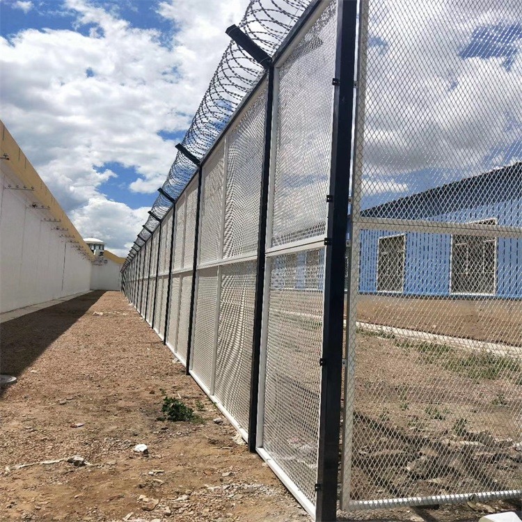 3、用专用的监狱隔离铁丝网连接件固定一般包括抱卡、M卡夹片等。