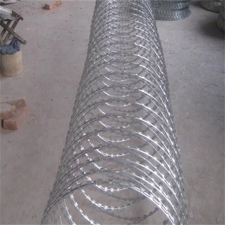 围墙刀刺网是由热镀锌板或不锈钢薄板冲压出尖锐的刀片状,高张力镀锌钢丝或者不锈钢丝做芯线组合而成的防护产品,利用不锈钢卡扣将刀片刺绳绕圈后相临两圈每隔120°用刺丝连接卡固定,张开后形成蛇腹网状,闭合后刀片刺绳圈径为50cm,张开后每交叉圈安装间距20cm,直径不小千45cm,由于刺网造形独特不易触摸,形成立体围护因而能达到好的防护隔离效果,该产品具有吓阳效果好,美观,施工便利,线型可随地势变换,经济实用等优异特点。