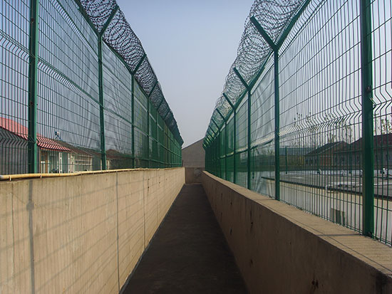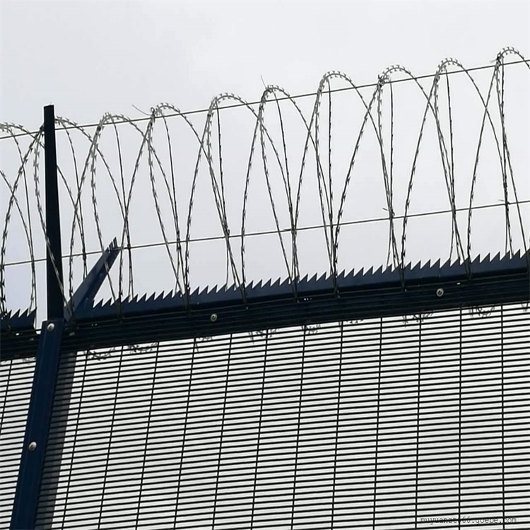 V字形单臂焊接固定钩子,用来固定拉丝。然后把看守所刀刺网架于V型支架上面,用专门]的卡扣固定。是围墙顶部用隔离网由V型支架立柱,加强型焊接片网,安全防盗连接件和热镀锌刀片刺笼组成强度和安全防御性级别很高。近年来被广泛应用在监狱军事基地等高安全场所,既起到围栏作用,又起到美化作用。由于具有安全性高,防鐢爬能力好,网片连接方式采用特制SBS紧扣件有效防止人为的破坏性拆卸,横向四道折弯加强筋,使网面强度显著增加。