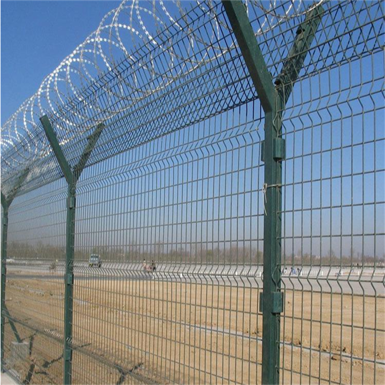 机场护栏网又称作“飞行区钢筋网围界”,是由V型支架立柱,加强型焊接片网,低碳钢丝编制焊接而成,安全防盗连接件和热镀锌刀片刺笼组成强度和安全防御性级别很高。网身高大,防攀爬能力强,抗冲击,表面双层优质防腐处理。