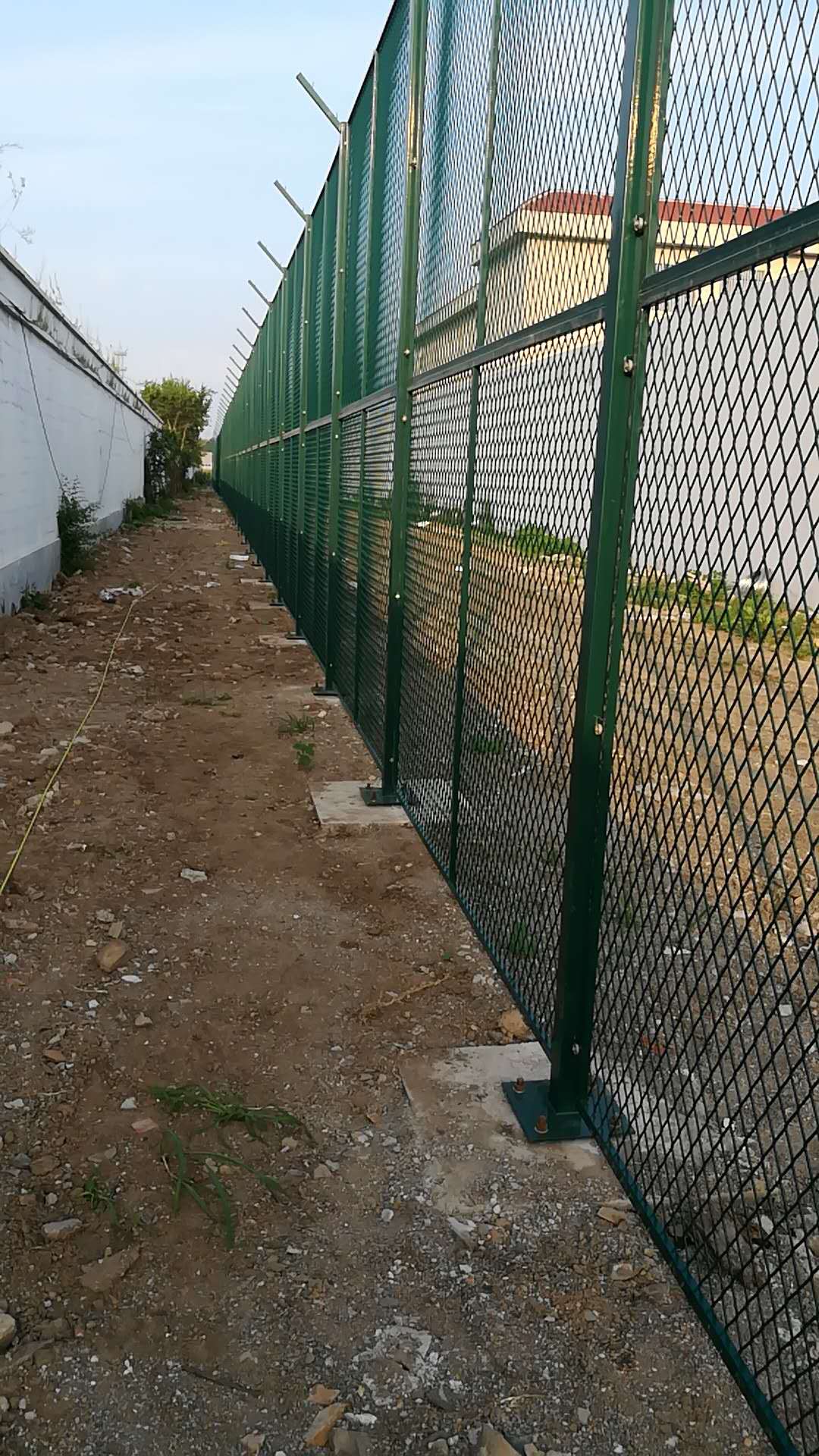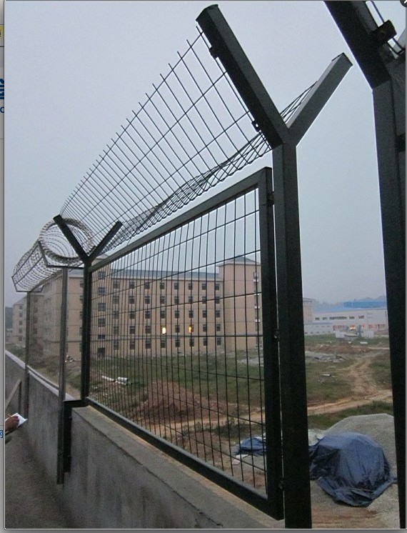 V字形单臂焊接固定钩子,用来固定拉丝。然后把看守所刀刺网架于V型支架上面,用专门]的卡扣固定。是围墙顶部用隔离网由V型支架立柱,加强型焊接片网,安全防盗连接件和热镀锌刀片刺笼组成强度和安全防御性级别很高。近年来被广泛应用在监狱、看守所、军事基地等高安全场所,既起到围栏作用,又起到美化作用。由于具有安全性高,防鐢爬能力好,网片连接方式采用特制SBS紧扣件有效防止人为的破坏性拆卸。