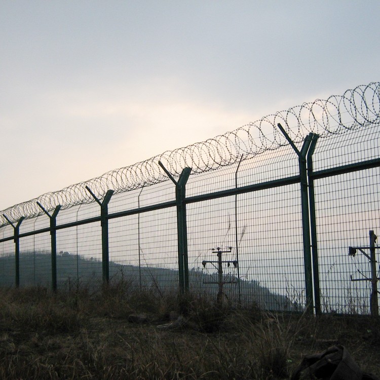 1、机场护栏通常是用带刺铁丝网固定的,这大大提高了安全性能