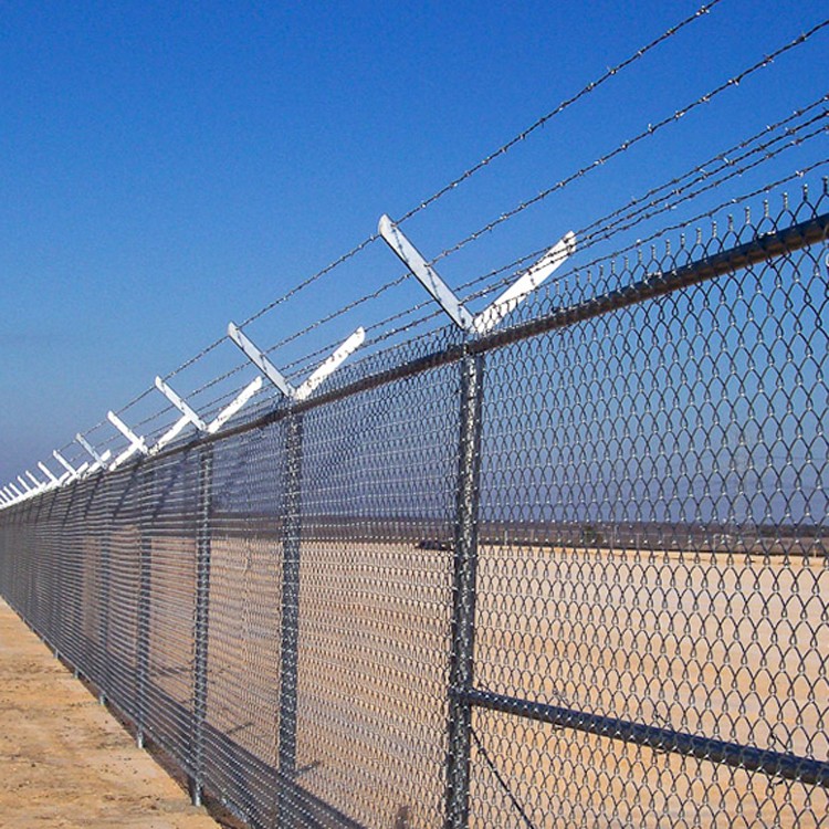 2、机场护栏也可以用倒钩桩,用三线倒钩线固定。机场栅栏可以用焊接的网板,也可以用链条网