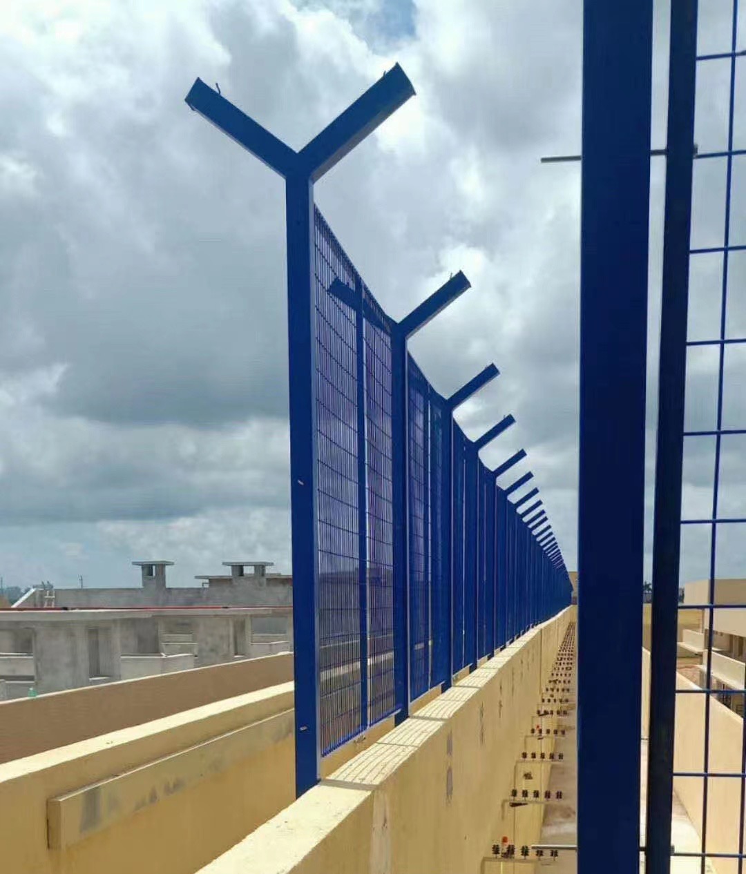立柱的顶部焊接V型支架(这种立柱也叫做Y型立柱),用来架设蛇腹形刀刺网,与下方的隔离网结合,形成一道难以逾越的铜墙铁壁。