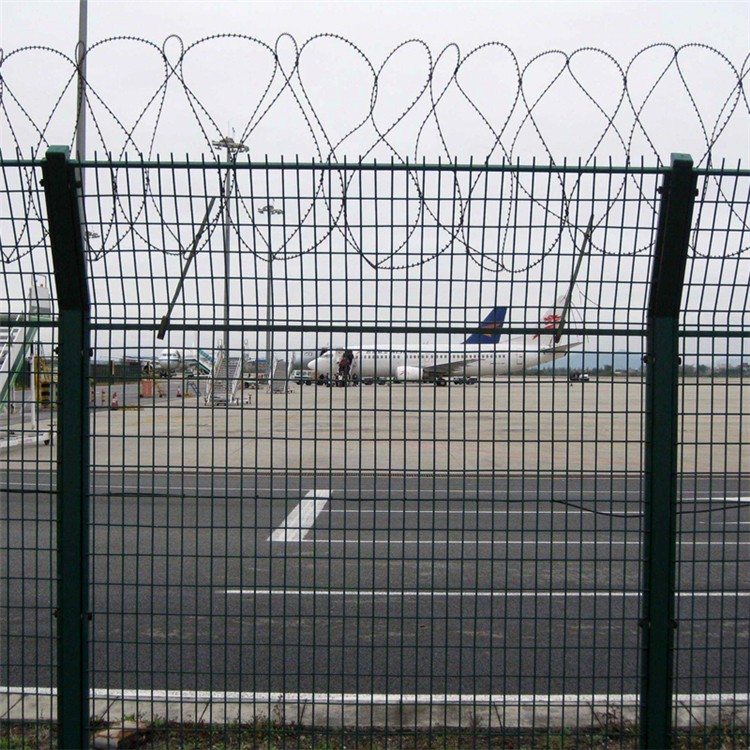 机场围网其产品造型美观、花色多样,既起到围栏作用,又起到美化作用。由于具有安全性高、防攀爬能力好,网片连接方式采用特制SBS紧扣件,有效防止人为的破坏性拆卸,横向四道折弯加强筋,使网面强度显著增加。