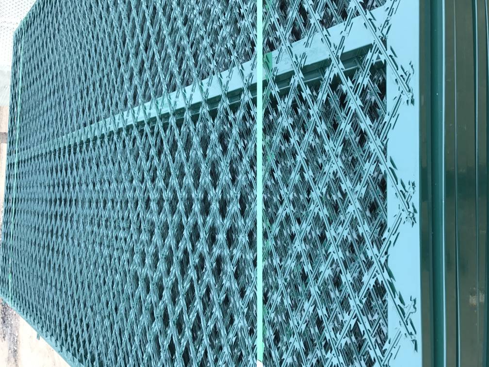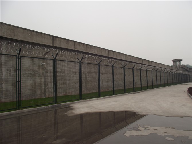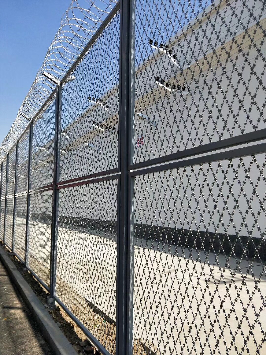监狱钢网墙一般顶端都设有V型支架与立柱焊接。材料通常选择和立柱同等材料或者稍小规格材料搭配使用。V型支架的加装是为了将蛇腹形刀刺网固定在钢网墙顶部,从而有效的增加监狱钢网墙的防攀爬性和安全性。V型支架加装防拆卸刀刺网。刀刺网的直径一般为500mm、600mm、800mm,材质均为优质304不锈钢,镍含量8个以上。刺网芯线直径为2.5mm、刀片长22mm,刀片宽度15mm,刀片厚度0.5mm。 蛇腹形刀刺网的排列密度不小于16圈/米,相邻每圈间距不大于120mm 。监狱用的刀刺网通常卡扣之间的距离是120mm,直径500mm的刀刺网 ,覆盖一米的重量约为2.38公斤(其他直径的覆盖长度可以详细询问安平县艾瑞金属丝网有限公司业务部,向您详细解答)。监狱钢网墙表面处理常分为热浸锌、浸塑、喷塑三种防腐处理。做完这些才能保证安全和基本10年左右的防腐。