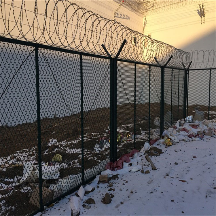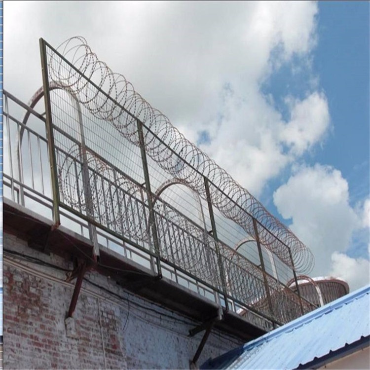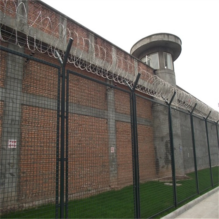 监狱防逃脱隔离网采用高强度的刀片刺网与普通防护网的结合,由V型支架立拄,加强型焊接片网,安全防盗连接件和组成。监狱护栏网监狱刀片钢网墙网格结构简练、便于运输、安装不受地形起伏限制,特别是对于山地、坡地、多弯地带适应性强。